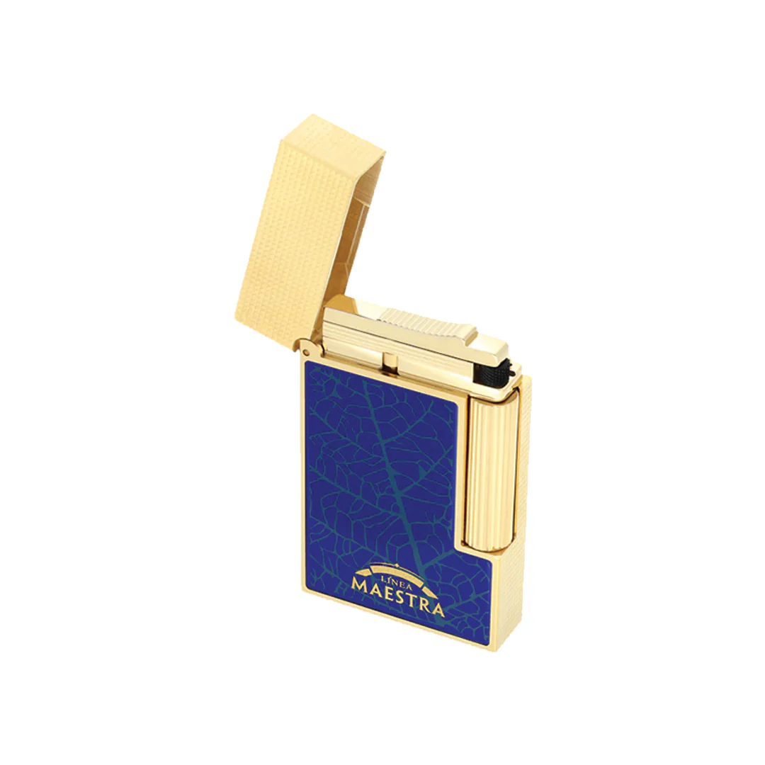 Crafted from precious materials, the iconic Ligne 2 is carefully coated with dark blue lacquer with a glossy finish. The Linea Maestra logo is stamped on the front of the piece, while the iconic Partagas factory design is applied to the back. Soft and adjustable double flame.